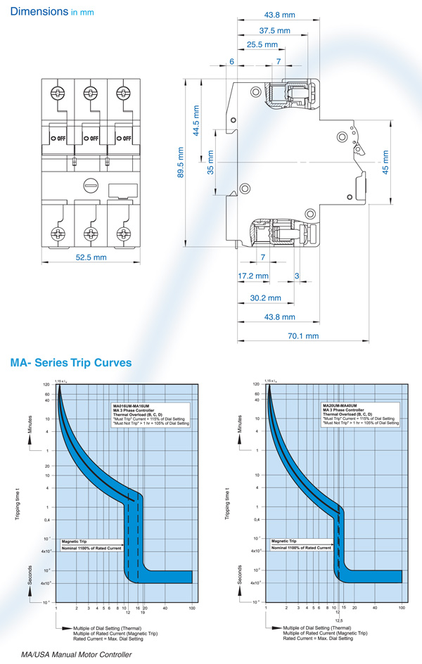 The MA was designed to handle the high inrush loads of 3 phase transformers, power supplies, motors, etc. The MA protects wiring and equipment from damage caused by the three major classes of overcurrent, yet greatly reduces the number of nuisance trips in high starting and inrush current circuits.